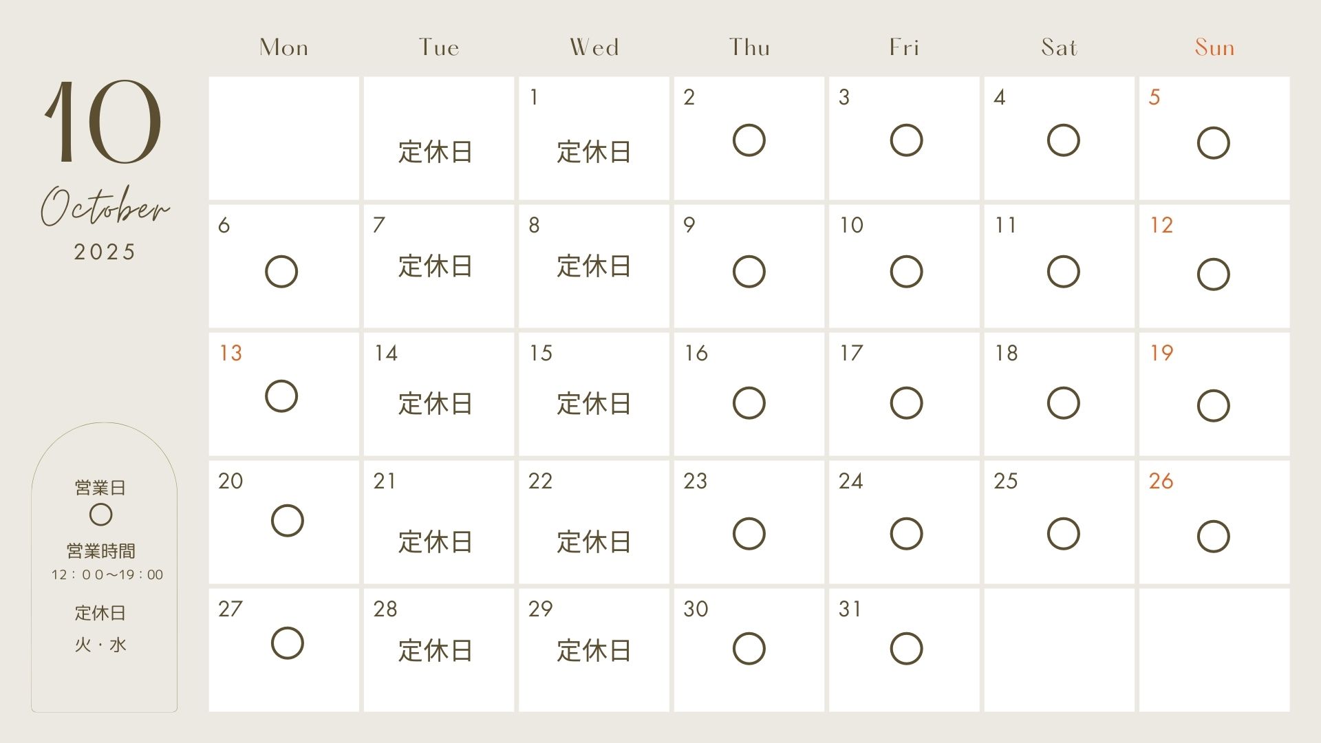2025年10月 実店舗営業スケジュール